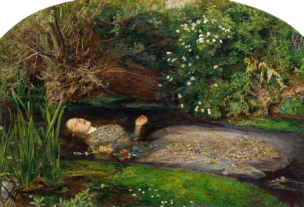 ハムレットの中で、オフィーリアが溺れる前に歌を歌っている姿を描いたものとのことです。色鮮やかで美しい作品ですね。